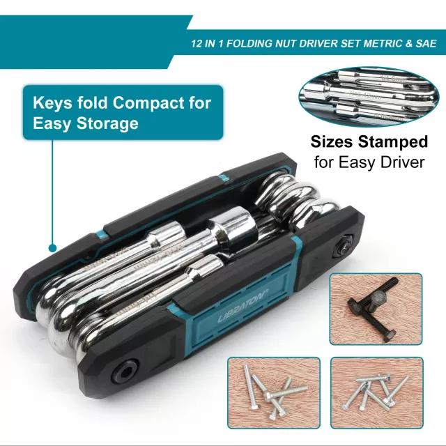 This versatile set includes six Metric sizes (5mm, 6mm, 8mm, 9mm, 10mm, 12mm) and six SAE sizes (3/16 in, 1/4 in, 5/16 in, 11/32 in, 3/8 in, 7/16 in), making it perfect for repairs at home, on the job, or on the go. Built from high-quality chrome vanadium steel, each nut driver offers reliable hardness and corrosion resistance, ensuring long-lasting performance. The heat-treated, chrome-plated shafts provide added durability, while the foldable design keeps the tools secure, organized, and easy to carry.