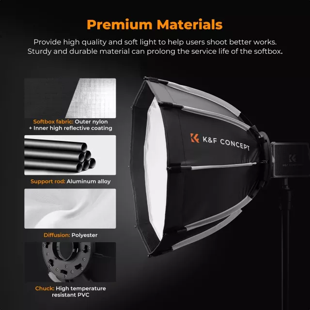 Crafted from high-quality nylon fabric with a reflective silver coating, this softbox ensures maximum light efficiency and even diffusion. The heat-resistant PVC mount maintains its shape even under continuous lighting, providing long-lasting performance. The included high-transmittance diffuser and honeycomb grid let you control light spread precisely, creating anything from a soft glow to a focused beam for dramatic effect.