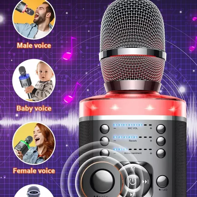 This wireless microphone offers everything you need for a lively karaoke experience. It includes 4 hilarious voice-changing modes — Baby Voice, Male Voice, Female Voice, and Devil’s Voice — guaranteed to keep everyone laughing. Colorful LED lights flash to the beat, instantly creating a party atmosphere perfect for Christmas gatherings, weddings, outdoor parties, and more.