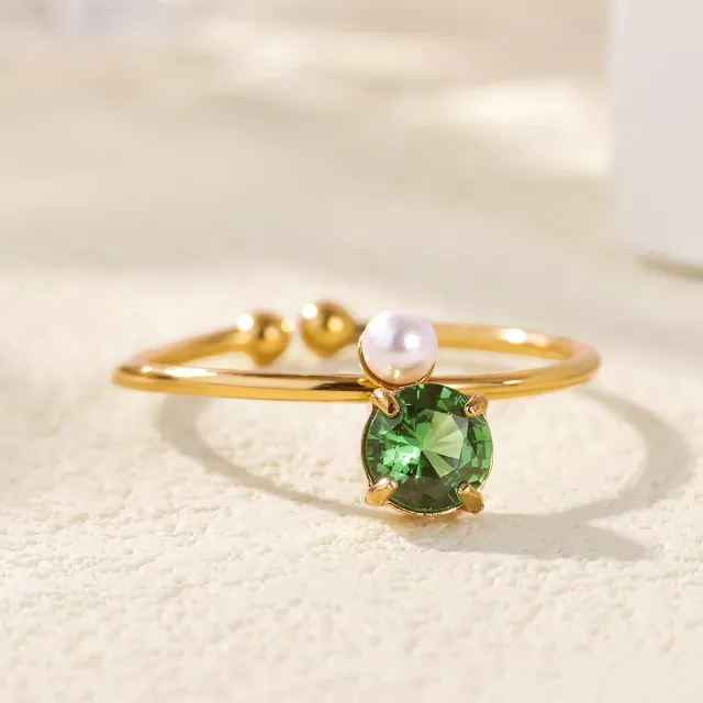 Bring a touch of elegance to your jewelry collection with this Green Zircon Adjustable Ring. Its timeless design and lustrous gold finish make it a standout accessory for any occasion. Whether you wear it alone for a minimalist look or stack it with other rings for added flair, this stunning piece will elevate your style with ease. Add it to your cart today and let your fingers sparkle with effortless charm!
