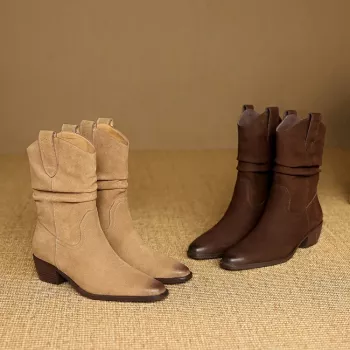 Women’s Suede Square Toe Mid Heel Ankle Boots – Handmade Fashion