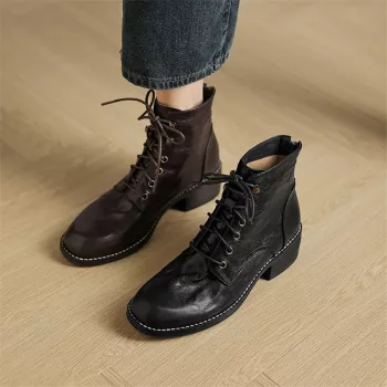 Women’s Genuine Leather Mid-Heel Ankle Boots with Lace Detail