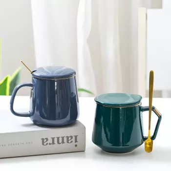 European Style Gold-Painted Ceramic Coffee Mug with Lid & Spoon – 13.5oz
