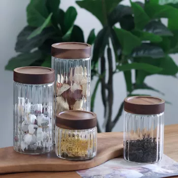 Striped Glass Tea Jar with Wooden Lid – 250ml Airtight Kitchen Storage