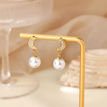 Elegant Moon & Pearl Dangle Earrings for Women – Cubic Zirconia Stainless Steel
