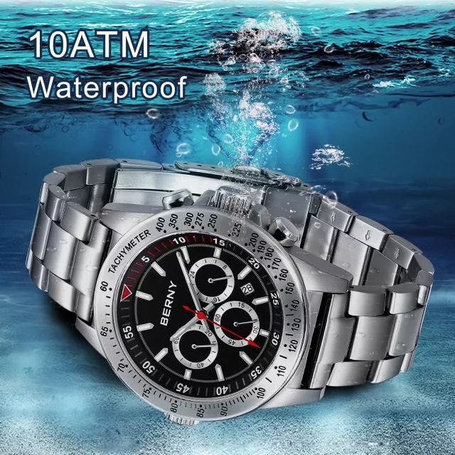 Built to last, this sports chronograph watch boasts a solid stainless-steel case and bracelet that resist wear and corrosion. The sapphire crystal lens shields the dial from scratches, maintaining its clarity and brilliance over time. With a 10ATM water resistance rating, this watch is perfect for swimming, showering, and diving up to 330 feet, giving you the freedom to move seamlessly from land to water.