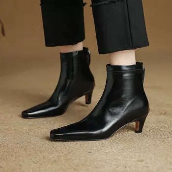 Women’s Genuine Leather Retro Ankle Boots – Square Toe High Heel Elegance