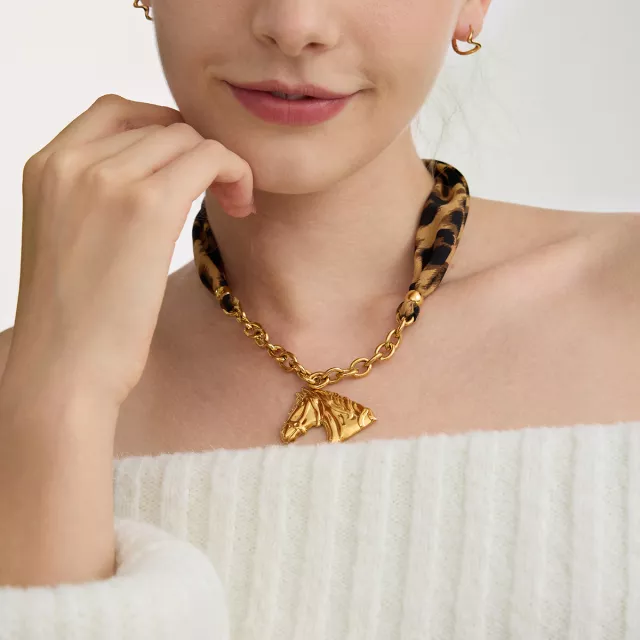 Make every outfit unforgettable with this Vintage Leopard Print Scarf Horse Pendant Necklace. Crafted from durable 18K gold-plated stainless steel, this piece combines sophistication with a hint of boldness. The stunning pendant features a graceful horse design wrapped in a leopard-print scarf motif—symbolizing strength, beauty, and a free spirit. Perfect for women who love to make a statement without saying a word.
