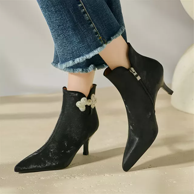 Winter Pointed Toe High Heel Ankle Boots for Women with Pearl Stiletto Heels