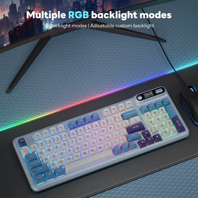 Enjoy a vibrant TFT color display that puts essential functions right at your fingertips. Switch modes, view animations, and interact with settings using an intuitive joystick and logo button. Its flexible connection options—Bluetooth 5.1, 2.4G wireless, and USB-C wired—allow you to pair up to three devices at once and switch between them instantly. At just over 15.3 inches wide, this compact 96% layout keeps all your must-have keys without taking up valuable desk space.