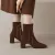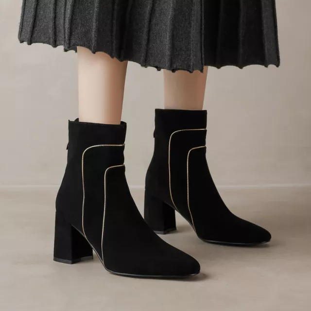 Featuring a 7.5 cm (3-inch) chunky square heel and a round toe, these boots provide stability without sacrificing height. The soft cow suede upper feels premium to the touch, while the pigskin insole adds a layer of comfort for all-day wear. The high-quality rubber outsole ensures slip-resistant traction, making them ideal for cool city strolls or chic office days. With a sleek zip closure, slipping them on and off is quick and easy.